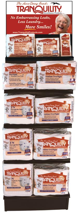 Box-SL321 includes: 2-Retail Bags of Medium Dau (2115); 2-Retail Bags of Large DAU (2116); 2-Retail Bags of Medium ATN Briefs (2185); 1-Retail Bag of X-Large DAU (2117); 1-Box of 9 2-pk Samples of Each Product in Plan-O-Gram & Shrink Wrapped (TRQ-036-PPD); Plan-O-Gram Layout Instructions (TRQ-036-PPA); Tranquility Sales Poster 24" x 12" (TRQ-036-PPB); 20-Tranguility Consumer Brochures (POG2202) with 1-Platic Brochure Holder (tRQ-036-PPC); Box-SL302-7 includes: 2-Retail Bags of Large ATN Briefs (2186), 2-Retail bags of X-Large ATN; 1-Retail Bag of X-Large DAU (2117); 2-Retail Bags of Super Personal Care Pads (2380); 2-Retail Bags of Ultimate Personal Care Pads (2381); 2-Retail Bags of Overnight Personal Care Pads (2382); 18-"Try It!" Rebates Pre-Stickered on each bag (TRQ-726-SL) and Plan-O-Gram Layout Instructions (TRQ-036-PPA).