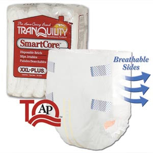 SmartCore disposable briefs maintain an ideal micro-climate for preserving skin integrity. The high capacity absorbent core remains effective up to 6-8 hours. The inner surface of the brief is treated with TQ-A/P (Tranquility Antimicrobial and Antifungal Protection). The treatment inhibits the growth of microorganisms while preserving an ideal environment on the product for skin integrity. Breathable sides eliminate heat and moisture build-up. Micro-hook closure tabs grip the soft, cloth-like outer layer to securely fasten the brief and allow for multiple openings. Kufguards®, inner leg cuffs, channel fluids into the core, helping to contain high volume urge episodes and bowel incontinence. The capacity/wetness indicator turns from yellow to blue when moisture is present. These briefs are available in 5 color-coded sizes. Latex free.