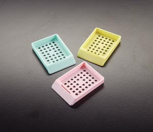 Suitable for holding and identifying tissue samples in processing, embedding, and sectioning procedures. Fits securely in microtome chuck adapters. They are molded from a high density polymer that is totally resistant to the chemical action of histological solvents. Designed to accept standard metal lids and will keep specimens in complete safety during processing. The slanted writing surface accepts markings easily, permitting sample identification throughout all stages of embedding and long afterwards when in archives. M480-1 is made of polypropylene; all others are made of acetal polymer.
